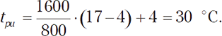 Máme stanovit průběh vnitřní povrchové teploty a teploty vnitřního vzduchu během zátopu v časech t = 0, 1, 3 a 4 h. Tepelná ztráta místnosti v čase t = 0 je Qc0 = 800 W, zátopový výkon otopného tělesa v místnosti Qt0 = 1600 W a akumulační doba místnosti tm = 40 h. Aktuální vnější teplota je te = 4 °C. Před zátopem byla místnost v teplotně ustáleném stavu. Vnitřní povrchová teplota v čase t = 0 je tp0 = 17 °C, celková plocha vnitřního povrchu stěn místnosti Sc = 85 m2. Průměrný součinitel prostupu tepla stěnami místnosti byl vypočítán podle vztahu (3). Má hodnotu Uc = 0,86 W·m–2·K–1.