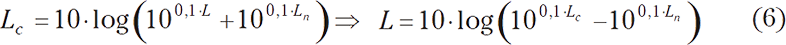 Stanovení korekce na hluk okolí vychází ve své podstatě z jednoduché představy o logaritmickém součtu dvou zdrojů. Celková hladina akustického tlaku Lc, změřená zvukoměrem v kontrolním místě, je dána logaritmickým součtem dvou dílčích zdrojů, měřeného stroje L a okolí Ln. Shodné výsledky jako v případě použití vztahu (4) a (5), získáme využitím vztahu (6) pro logaritmický součet.