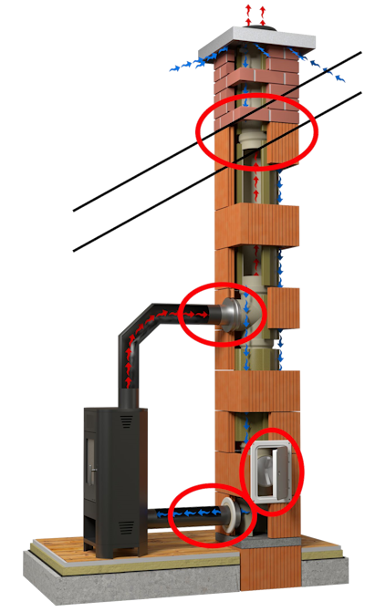 - Těsné řešení všech potřebných detailů komína – od větrací mřížky, přes těsné napojení kouřovodu na komín až po těsná komínová dvířka.