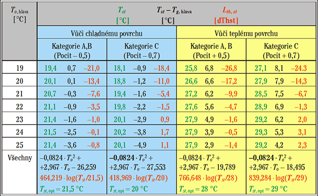 Současně také odpovídají kategorii C dle ČSN EN 7730 (tab. 2). Redukce dolních limitů pro chlad je důsledkem vyšší senzitivity lidského organizmu na chlad než na teplo (Jokl 2011).