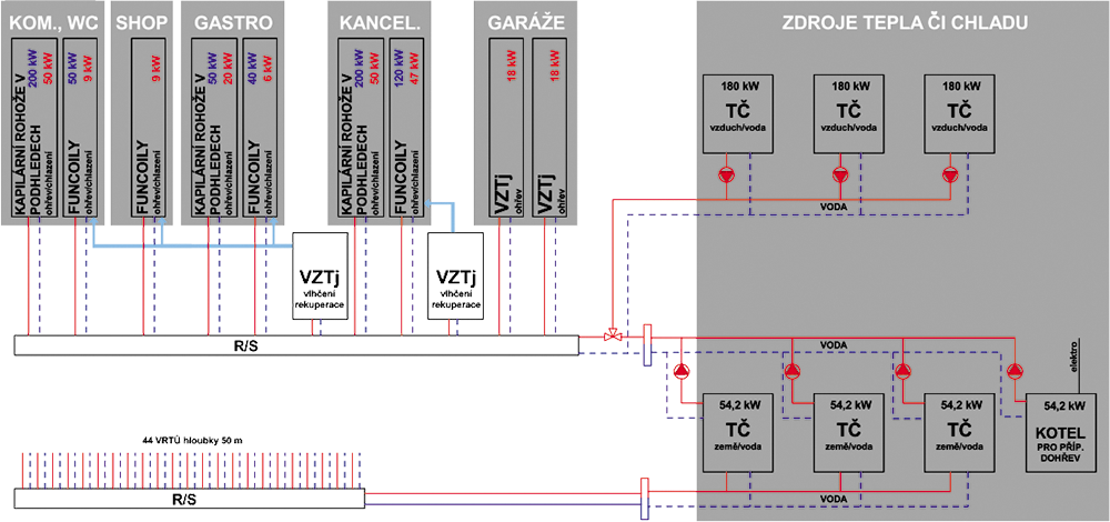 Přenos tepla a chladu do jednotlivých zón zajišťuje vodní soustava využívající aktivace železobetonové stropní konstrukce, kterou doplňuje vzduchotechnický klimatizační systém.