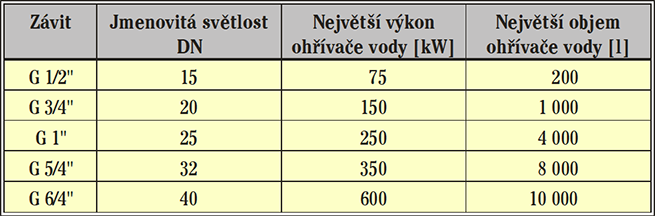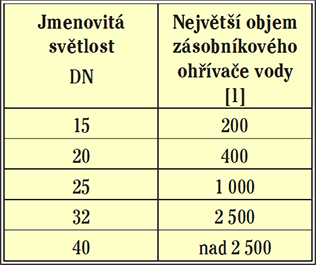 Jmenovitá světlost pojistného ventilu, který je osazen na přívodním potrubí studené vody k ohřívači jako samostatná armatura nebo je součástí pojistné skupiny, se stanovuje podle tab. 2. Pokud se k ohřívači osazuje expanzní nádoba, má být při průtoku ohřívané vody ohřívačem zajištěna výměna vody v této expanzní nádobě.