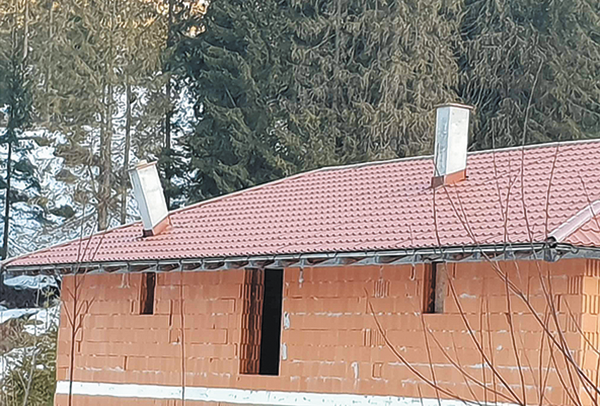 Na fotografii novostavby z podhorské oblasti jsou dva zděné komíny. Na jednom je na první pohled vidět deformace způsobená odlomením celé nadstřešní části a jeho vychýlením mimo svoji osu. Patrné je zde i poškození klempířských prvků, na kterých pravděpodobně celá váha odlomené části visí.