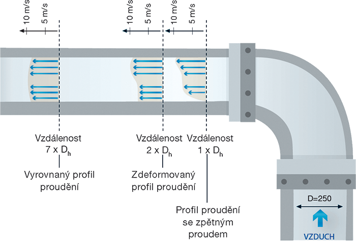 V praxi tlumiče, ventily, kolena a jiné ohyby brání vytvoření konzistentního proudění. Za nepříznivých okolností to vede k tomu, že maximální profil proudění není ve středu potrubí, ale je posunut směrem k okraji, v horších případech mohou také vzniknout zpětné proudy nebo oblasti bez proudění. Zpětné proudy se zpravidla zmenšují po vzdálenosti 2násobku hydraulického průměru od zdroje rušení, avšak profil proudění je tak silně zkreslený, že je zapotřebí velký počet bodů měření, aby se zachovala nízká nejistota měření.