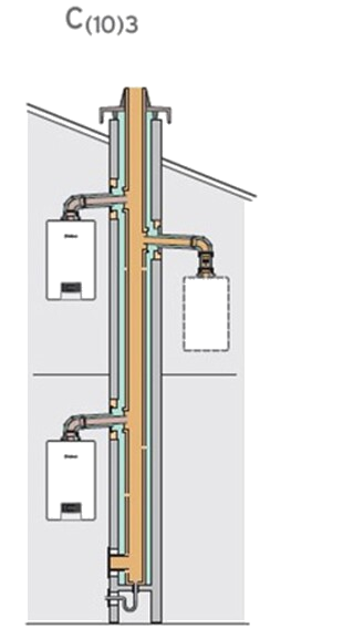 Řada koncových uživatelů provozuje své kondenzační kotle v bytových domech, kde byl instalován společný přetlakový komín. Tyto společné komíny postupně vznikaly po roce 1989, zejména v nově stavěných bytových komplexech. Jednalo se o typ instalace s označením C(10)3 - přetlakový systém, kde stavební šachtou je přiváděn spalovací vzduch k jednotlivým spotřebičům a vložkou (keramickou nebo nerezovou) jsou odváděny spaliny do venkovního prostoru (obr. 1) Připojení kotlů ke společné spalinové cestě bylo řešeno ve většině případech pomocí koaxiálního připojovacího potrubí.
