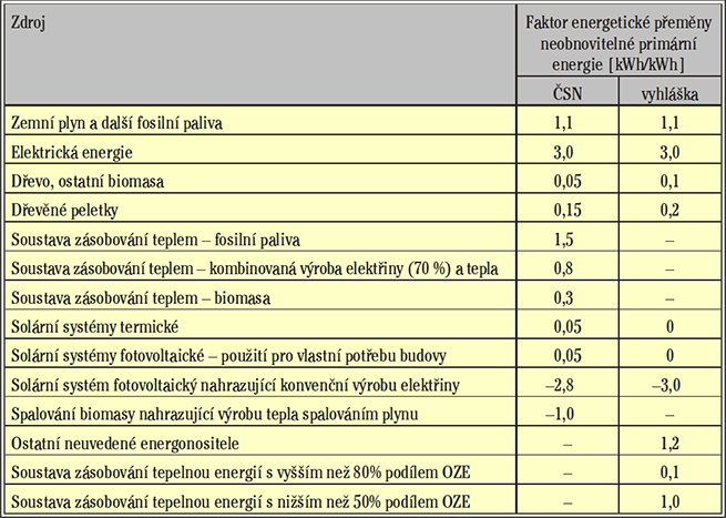 Faktor energetické přeměny pro přepočet na hodnoty primární energie, dle normy ČSN 73 0540-2 Tepelná ochrana budov – Část 2: Požadavky a dle vyhlášky č. 78/2013 Sb., je znázorněn v tabulce 1.